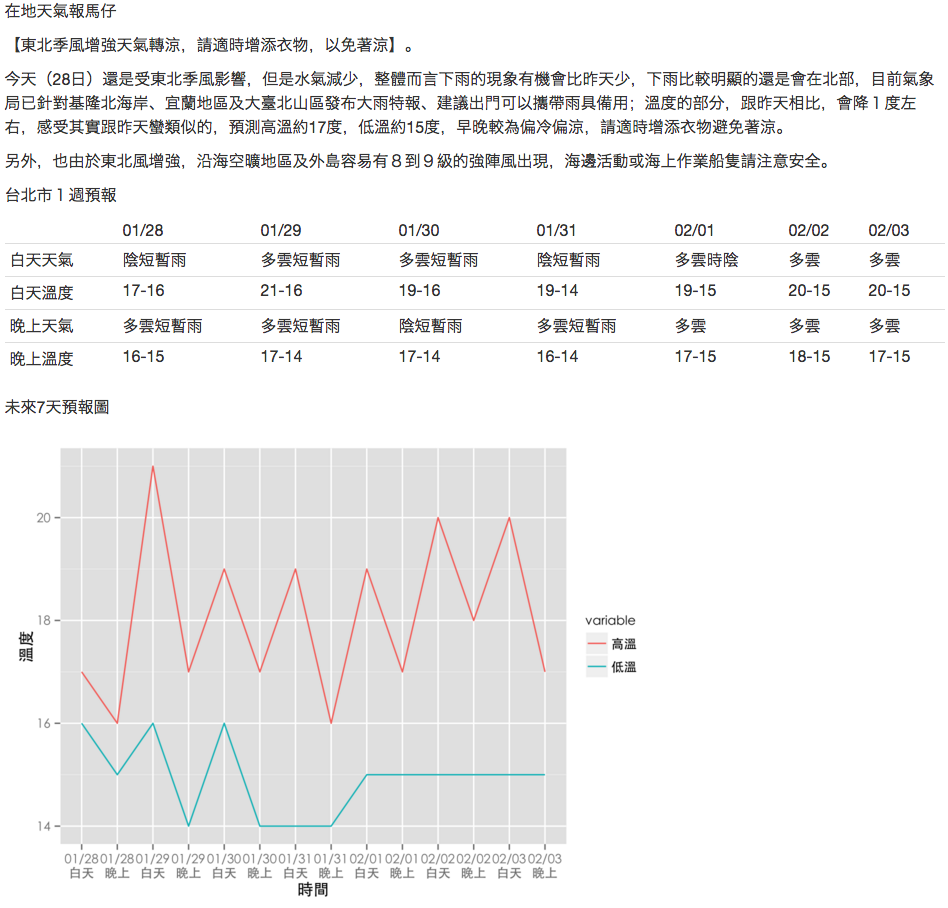 # 預測高溫約`r max(dat[1:2,4:5])`度,低溫約`r min(dat[1:2,4:5])`度