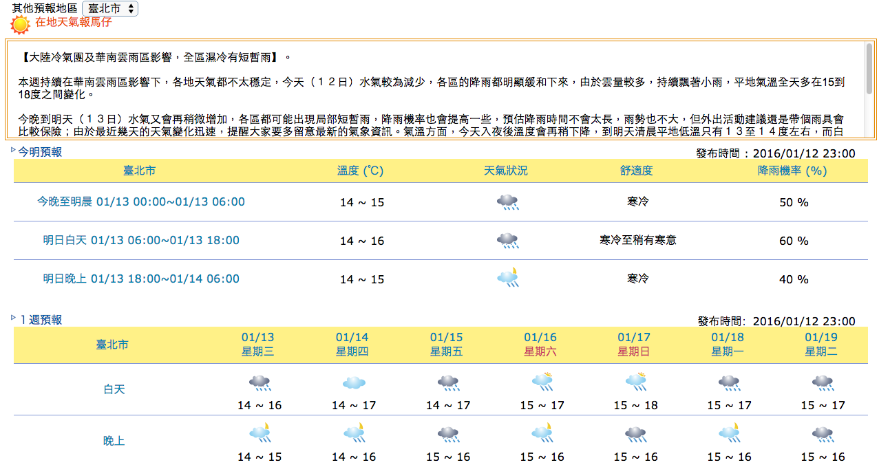 | 白天溫度 | 17-16 | 21-16 | 19-16 | 19-14 | 19-15 | 20-15 | 20-15 |
